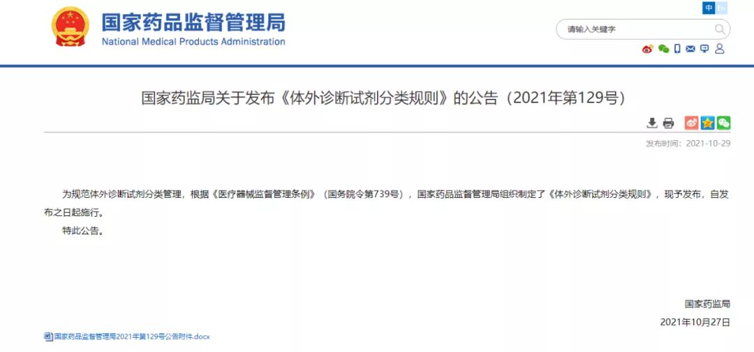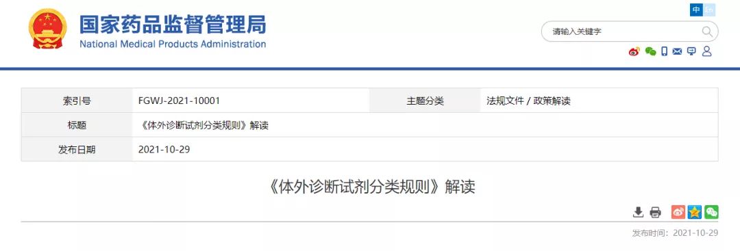 第八條 體外診斷試劑分類目錄由國家藥品監(jiān)督管理局制定并發(fā)布。國家藥品監(jiān)督管理局根據(jù)體外診斷試劑生產(chǎn)、經(jīng)營、使用情況,及時對體外診斷試劑的風(fēng)險變化進行分析、評價,對體外診斷試劑分類目錄進行調(diào)整。