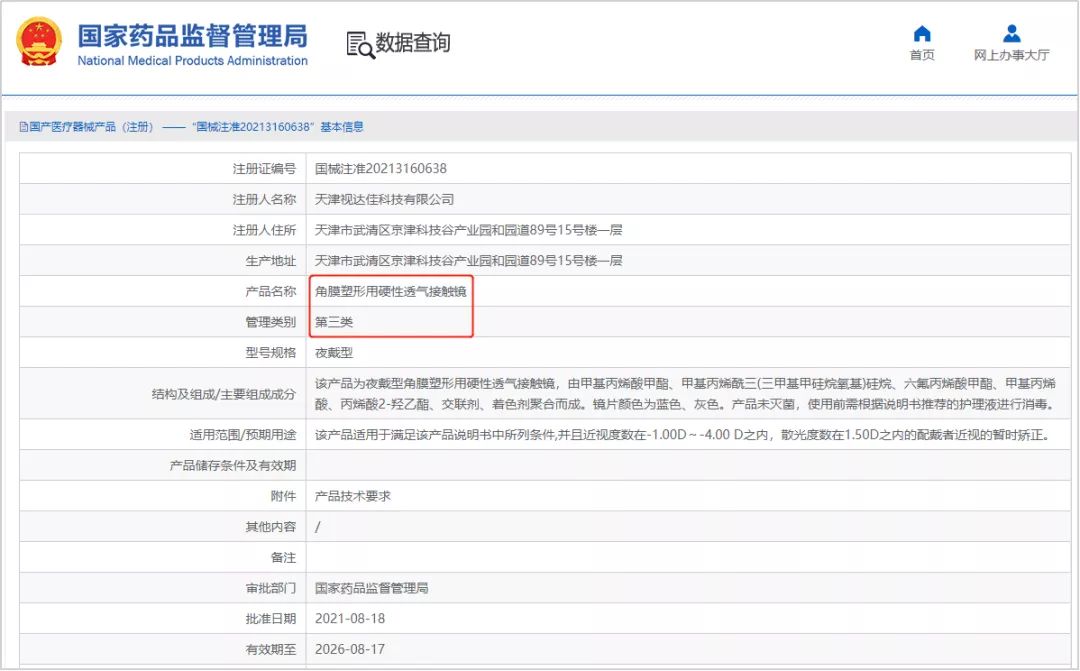 ——2021年8月18日,天津視達(dá)佳科技有限公司生產(chǎn)的產(chǎn)品“夜戴型角膜塑形用硬性透氣接觸鏡(ok鏡)”獲批國(guó)家藥監(jiān)局三類(lèi)醫(yī)療器械注冊(cè)證(國(guó)械注準(zhǔn)20213160638),這也是國(guó)產(chǎn)的第三張角膜塑形鏡產(chǎn)品證書(shū)。