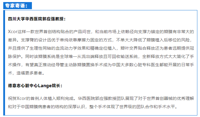 2022年5月20日,四川大學(xué)華西醫(yī)院郭應(yīng)強(qiáng)教授團(tuán)隊(duì)成功應(yīng)用南京圣德醫(yī)療科技有限公司研制的帶結(jié)構(gòu)貼合錨定及全新釋放方式的自膨式TAVR產(chǎn)品Xcor,為一位外科高危高齡重度主動(dòng)脈瓣狹窄合并中度關(guān)閉不全患者實(shí)施了經(jīng)導(dǎo)管主動(dòng)脈瓣膜置換手術(shù)。該例手術(shù)也標(biāo)志著,由四川大學(xué)華西醫(yī)院郭應(yīng)強(qiáng)教授牽頭的全國(guó)多中心研究正式起航。