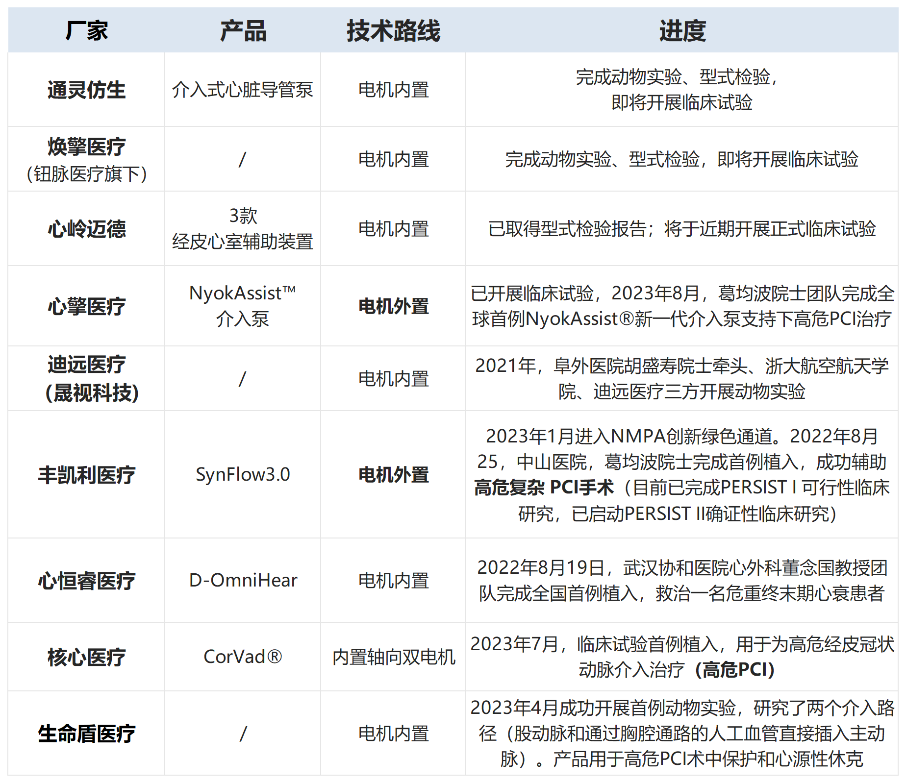 介入式人工心臟是高技術、高門檻賽道,國內有少數創(chuàng)新企業(yè)布局。其中,心恒睿醫(yī)療、核心醫(yī)療、通靈仿生、心嶺邁德、晟視科技、心擎醫(yī)療、豐凱利醫(yī)療等企業(yè)不僅在資本寒冬期逆勢完成融資,且相關產品推進順利,進展極快。