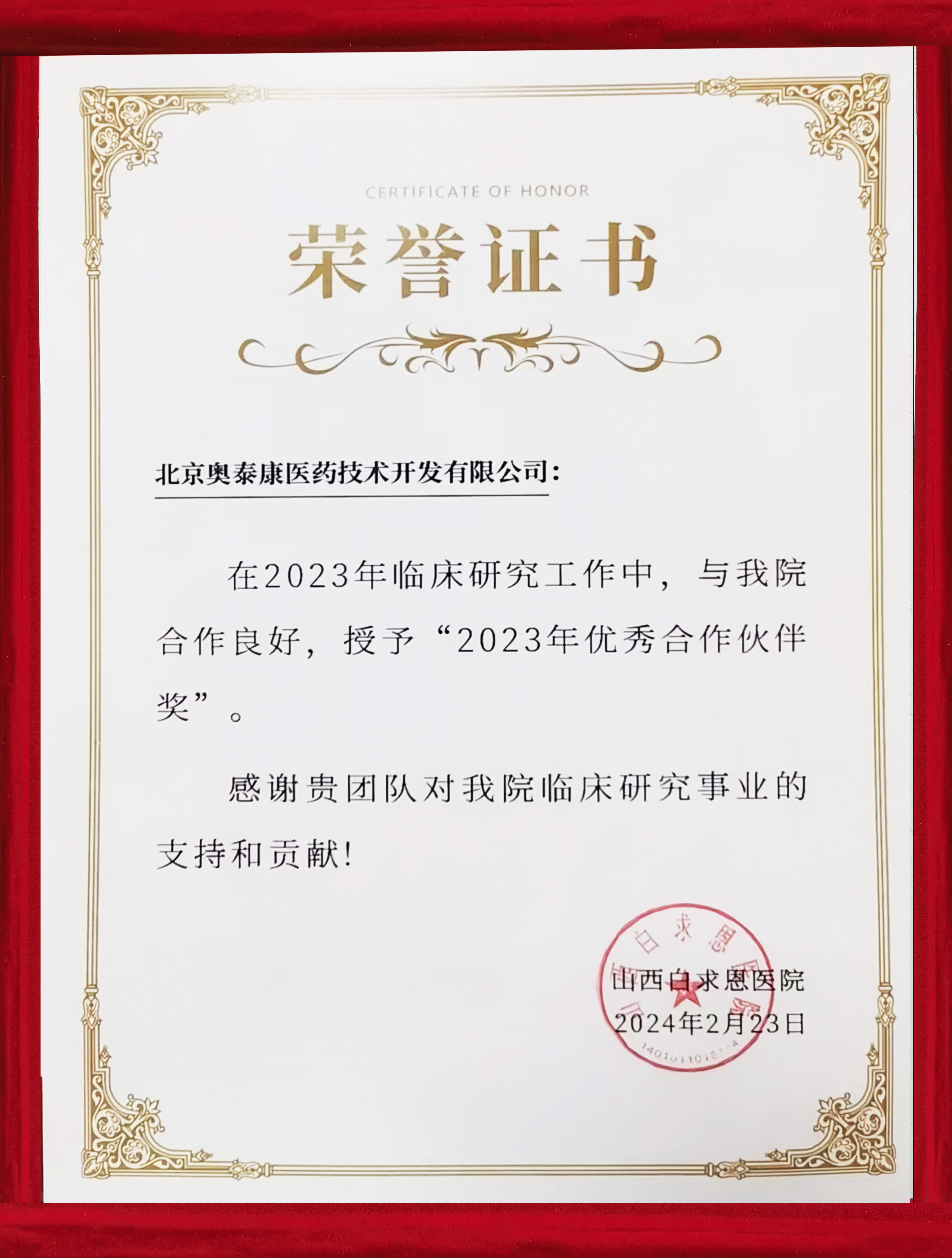 喜報~奧泰康榮獲山西白求恩醫(yī)院 同濟(jì)山西醫(yī)院“2023年優(yōu)秀合作伙伴獎”攜手前行,推進(jìn)臨床研究事業(yè)高質(zhì)量發(fā)展???前言