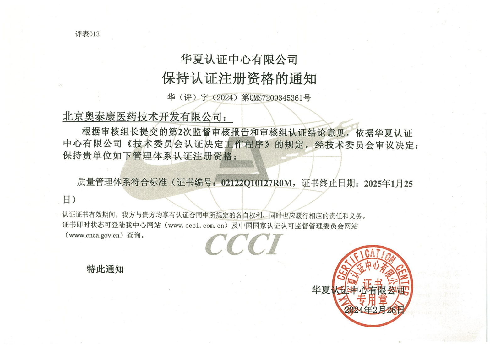 近日,北京奧泰康醫(yī)藥技術(shù)開(kāi)發(fā)有限公司經(jīng)華夏認(rèn)證中心有限公司(CCCI)認(rèn)證,順利通過(guò)ISO9001:2015 標(biāo)準(zhǔn)質(zhì)量管理體系認(rèn)證年度審核,認(rèn)證范圍為醫(yī)療器械臨床試驗(yàn)及產(chǎn)品注冊(cè)服務(wù)。