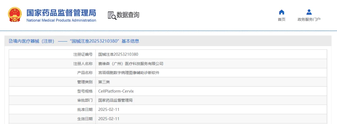 賽維森科技自主研發(fā)的“宮頸細胞數(shù)字病理圖像輔助診斷軟件”,正式獲得國家藥監(jiān)局(NMPA)頒發(fā)的第三類醫(yī)療器械注冊證,是宮頸細胞學(xué)領(lǐng)域首張“輔助診斷”三類證。人工智能正式升級為醫(yī)生的“超級助手”?。ㄗ宰C編號:國械注準20253210380)