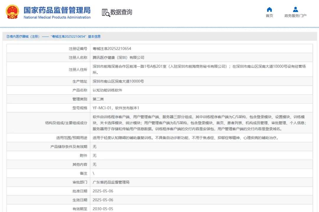 近期,經(jīng)國家藥品監(jiān)督管理局公示,騰訊醫(yī)療健康(深圳)有限公司自主研發(fā)的認(rèn)知功能訓(xùn)練軟件(粵械注準(zhǔn)20252210654)獲得NMPA批準(zhǔn)上市,奧泰康提供MA解決方案。