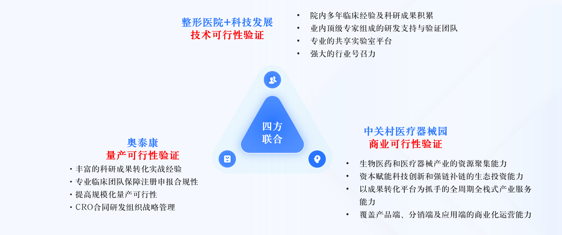 北京市整形醫(yī)學(xué)概念驗(yàn)證中心項(xiàng)目,由四家單位聯(lián)合申報(bào)實(shí)施。其中北京八大處整形科技發(fā)展有限公司聯(lián)合中國醫(yī)科院整形外科醫(yī)院完成技術(shù)可行性驗(yàn)證,北京奧泰康醫(yī)藥技術(shù)開發(fā)有限公司負(fù)責(zé)量產(chǎn)化驗(yàn)證,中關(guān)村醫(yī)療器械園有限公司完成商業(yè)化驗(yàn)證,四方相互協(xié)同,構(gòu)建“醫(yī)研產(chǎn)銷”一體化生態(tài)。
