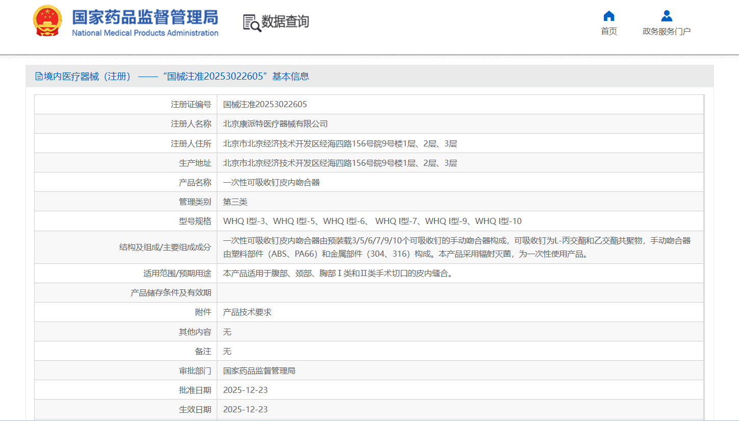 MA成果[慶祝] 奧泰康助力康派特醫(yī)療「一次性可吸收釘皮內(nèi)吻合器」獲批上市[煙花] ——系本年度助力獲得的第19張三類注冊(cè)證??近期,經(jīng)國家藥品監(jiān)督管理局公示,北京康派特醫(yī)療器械有限公司自主研發(fā)的產(chǎn)品一次性可吸收釘皮內(nèi)吻合器(國械注準(zhǔn)20253022605)獲得NMPA批準(zhǔn)上市,奧泰康提供MA解決方案。