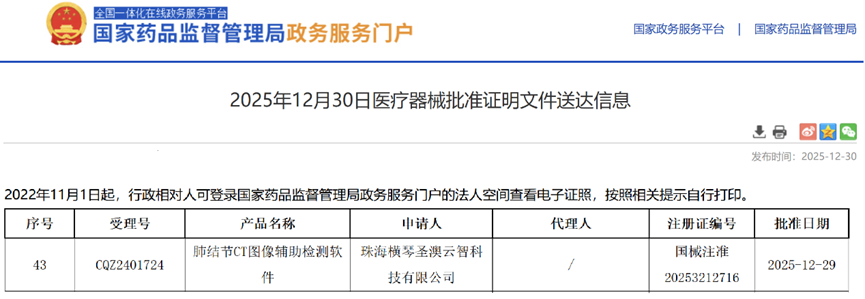 2025年12月31日,經(jīng)國(guó)家藥品監(jiān)督管理局公示,珠海橫琴圣澳云智科技有限公司的肺結(jié)節(jié)CT圖像輔助檢測(cè)軟件(國(guó)械注準(zhǔn) 20253212716)獲得NMPA批準(zhǔn)上市,奧泰康提供MA解決方案。